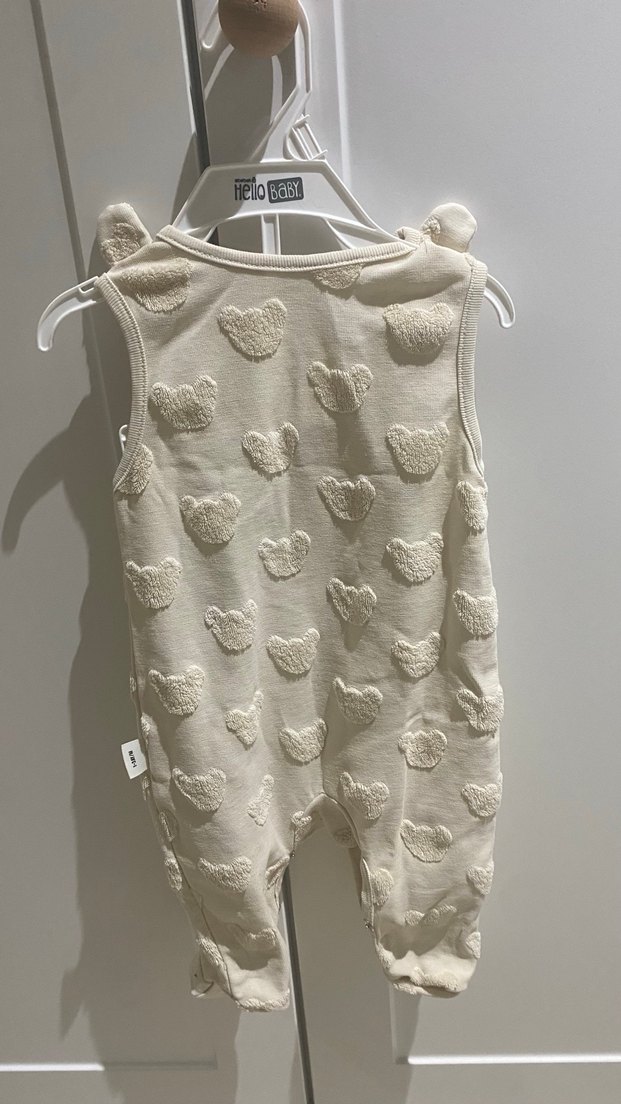 Yumuşak dokulu beyaz triko bebek tulumu, pastel tonlarda ve sevimli ayıcık desenleriyle rahat ve konforlu.