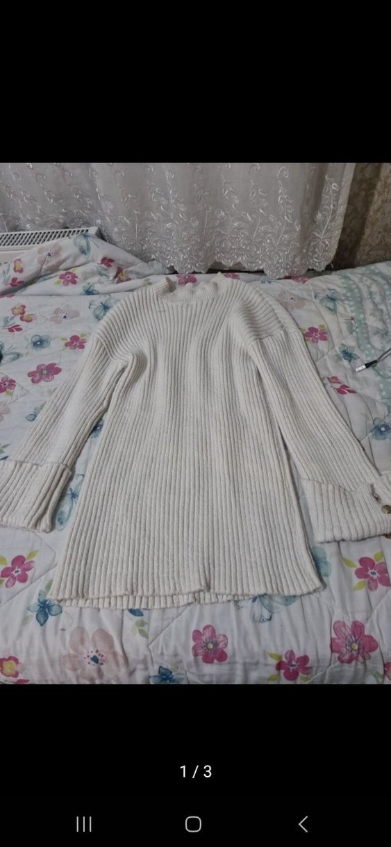 Beyaz renkte, bol kesim, uzun kollu ve boğazlı yaka tasarımlı triko kazak, rahat ve günlük kullanıma uygundur.