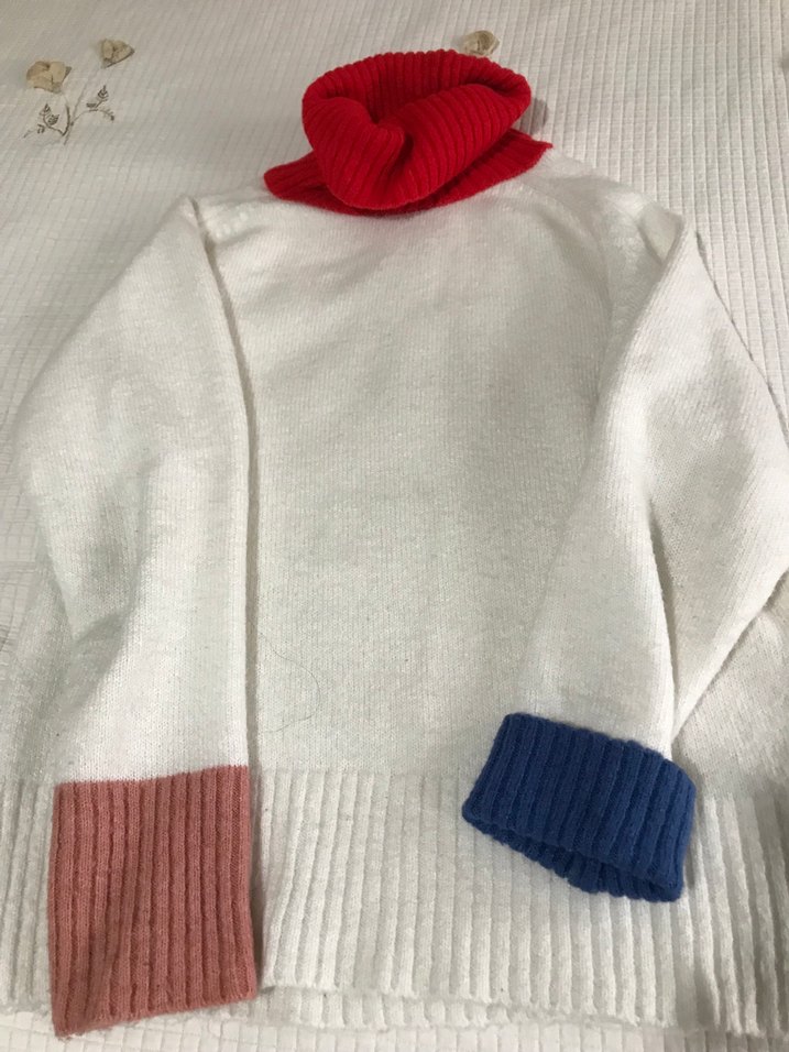 Bu beyaz triko kazak, bol kesim ve uzun kollara sahip olup, kırmızı, pembe ve mavi renk bloklu manşetler içerir. Rahat boğazlı ve midi uzunluktadır, günlük sokak modasına uygundur. ❄️m/l beden uyumlu