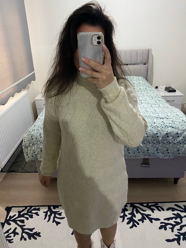 Krem triko, boğazlı, uzun kollu ve bol kesim midi uzunluğunda. Yumuşak dokusu ile günlük kullanıma uygundur. Kemerler dahil değildir