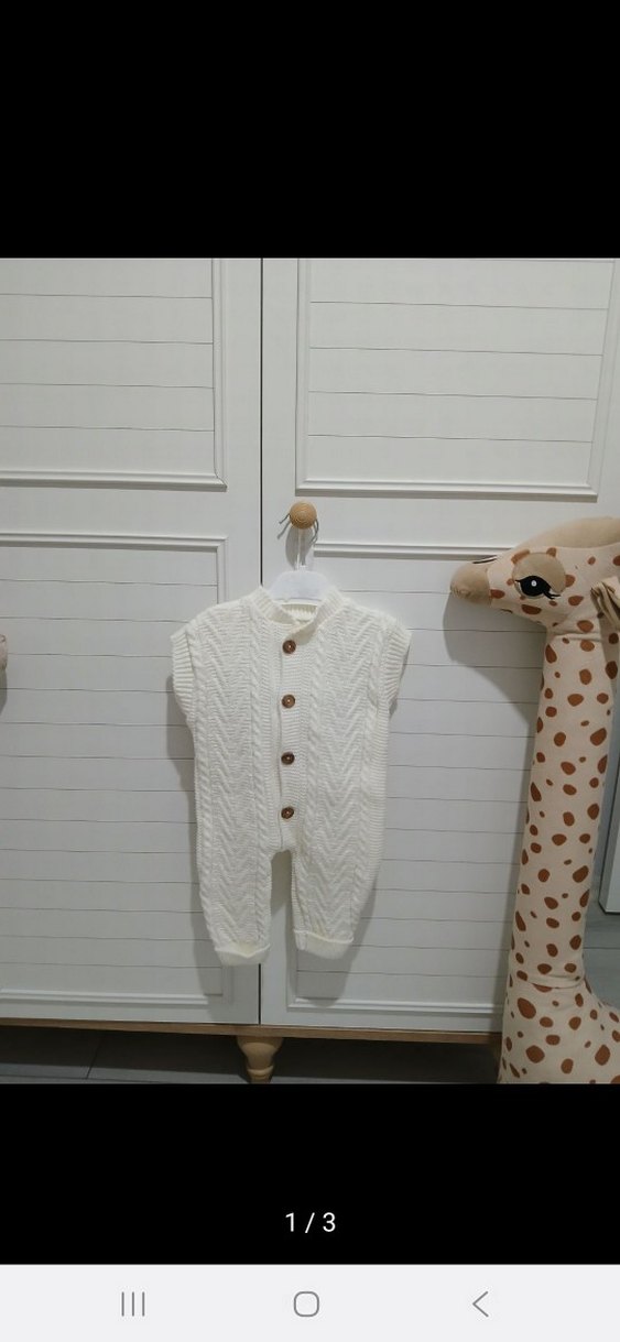 Bu beyaz triko erkek bebek tulumu, kolsuz tasarımı, boğazlı yakası ve ahşap düğmeleri ile modern klasik bir stile sahiptir.sadece 1 kez çekimde giydi 0.3 ay oglum prematüre olduğu içn 6 aylıkken giydi