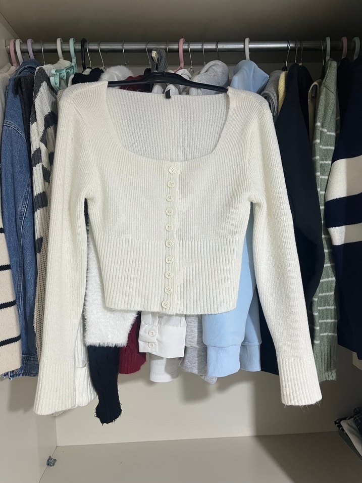 Bu beyaz triko hırka, fit kesimi, uzun kolları ve yuvarlak yakasıyla dikkat çeker. Düğmeli ön kısmı ve rahat dokusuyla günlük sokak stiline uygundur.