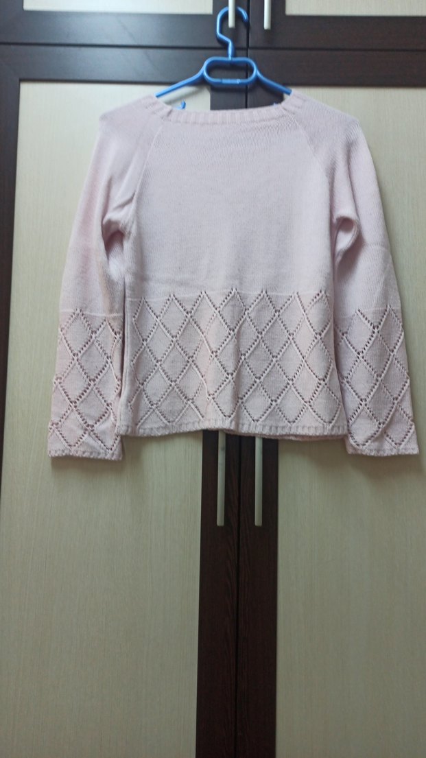 Beyaz renkli, yuvarlak yaka ve uzun kollu triko kazak. Alt kısım ve kollarında baklava desenli örgü detayları bulunur, rahat ve sade bir modeldir.