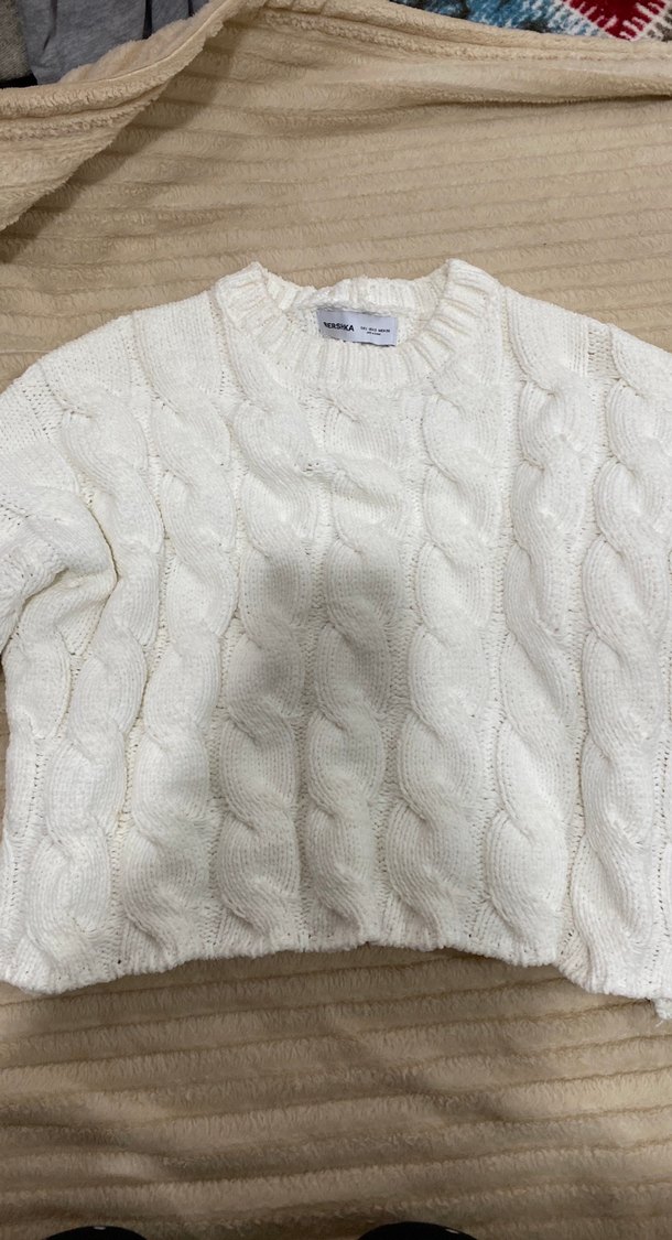 Bu beyaz triko kazak, yuvarlak yakalı ve uzun kollu olup, bol kesimiyle rahat ve sade bir stil sunar.