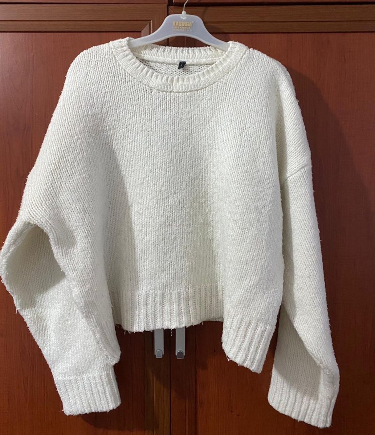 Beyaz renkli, triko dokulu, yuvarlak yakalı ve uzun kollu kadın kazak. Salaş kesimi ve normal boyu ile günlük kullanıma uygundur. ☁️