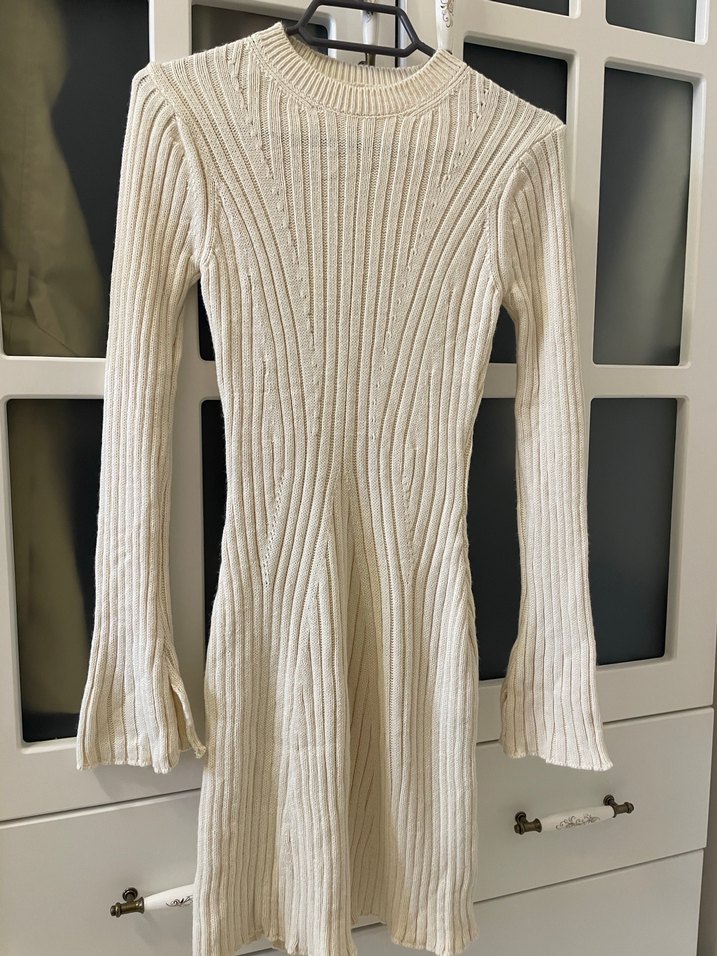 Beyaz renkli, triko kumaştan yapılmış, uzun kollu ve yuvarlak yakalı, vücuda oturan midi elbisedir. Desensiz ve modern klasik tarzıyla günlük kullanıma uygundur. (Butik mağazadan alındı nere olduğunu hatırlayamıyorum fakat beden uymadığı için hiç giyilmedi 36-38 beden için uygun)