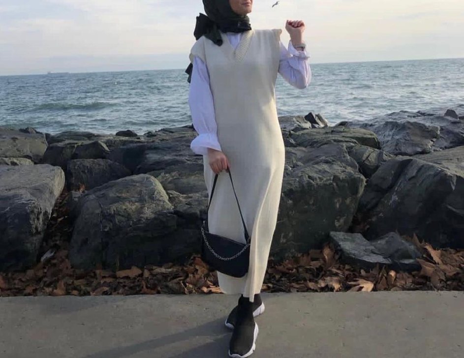 Beyaz renkte, yüksek yakalı uzun elbise. Kolsuz ve düz tasarımlı, rahat sentetik kumaştan üretilmiştir. Günlük sokak stiline uygundur.