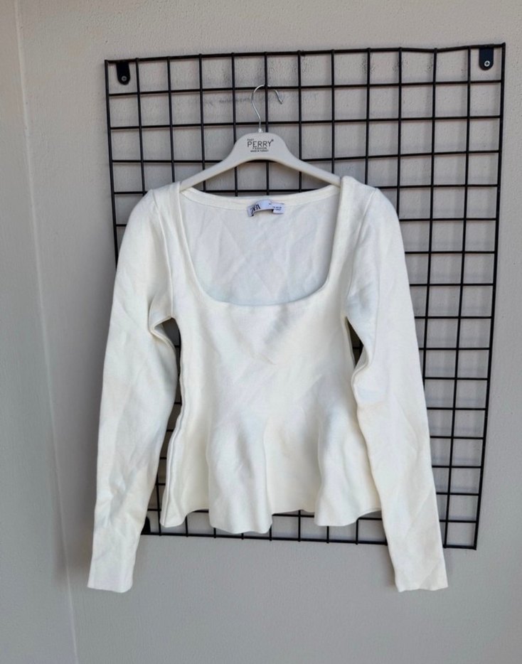 Beyaz triko, uzun kollu ve kare yaka detaylı, yumuşak keten kumaştan, regular fit ve kısa boyda minimalist sokak stili bluz.