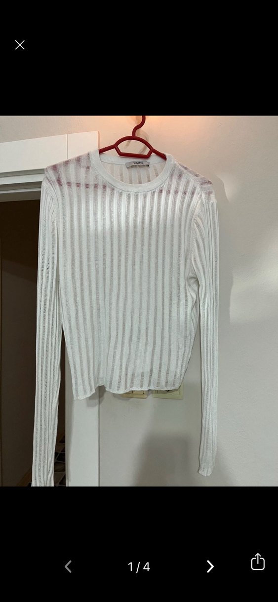 Beyaz, triko dokuma uzun kollu ve bisiklet yaka kazak. İnce kesimli, midi boy ve keten kumaştan, trend sokak stiline uygun.