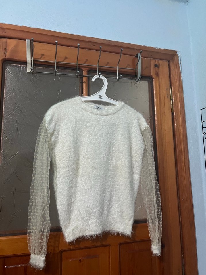 Beyaz renkte, triko kumaştan, uzun kollu ve salaş kesime sahip, günlük kullanıma uygun rahat bir kazak. Yaka tipi yuvarlak ve desensizdir.