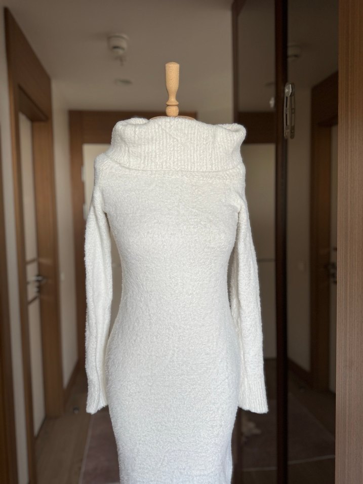Beyaz Triko Yüksek Yakalı Uzun Kollu Kadın Elbise - Görsel 3