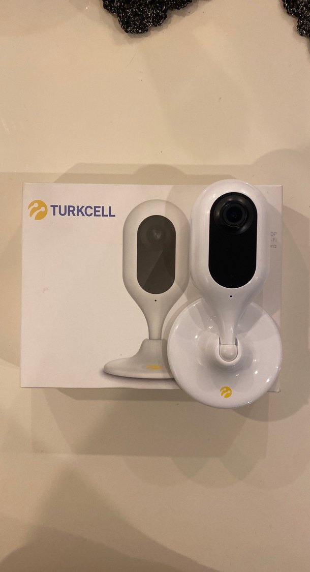 Beyaz renkte, yuvarlak tabanlı ve siyah lensli Turkcell video kamera. Net görüntü sağlar ve Turkcell logosu bulunur. Kablo ve piriz girişi yoktur. Çalışır durumdadır.