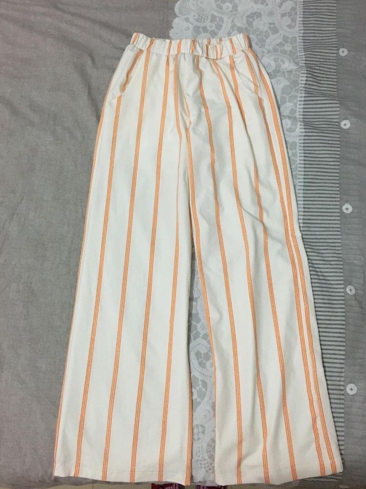 Beyaz pamuklu, turuncu pastel çizgili, bol kesim geniş paça pantolon. Günlük rahat kullanım için uygundur. Yarıya kadar astarı mevcuttur. 2 kez giyildi