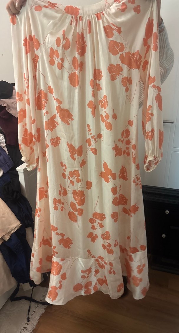 Uzun, bol kesim elbise, ipeksi kumaş ve drapeli tasarıma sahip. Uzun kollu, beyaz zemin üzerine turuncu çiçek desenleriyle bohem vintage stilinde.