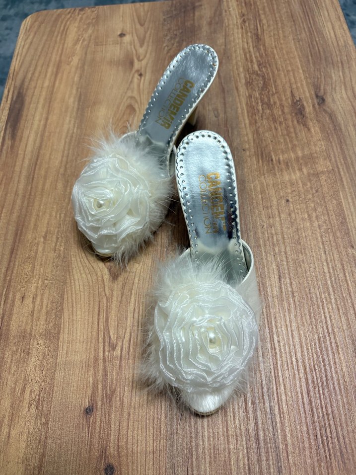 Beyaz Tüylü Çiçek Detaylı Kadın Dolgu Topuk Terlik