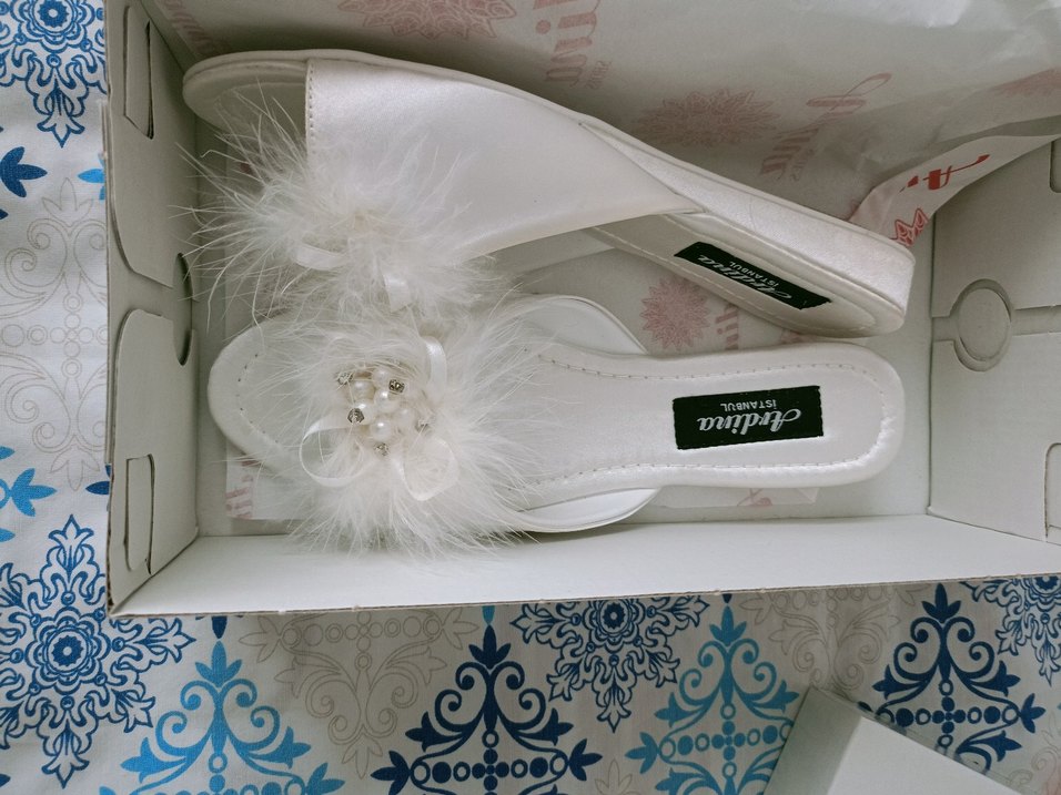Beyaz, sentetik kumaştan yapılmış, dolgu topuklu kadın terlik. Tüylü detayları ve çiçek desenleriyle klasik vintage tarzı yansıtıyor.