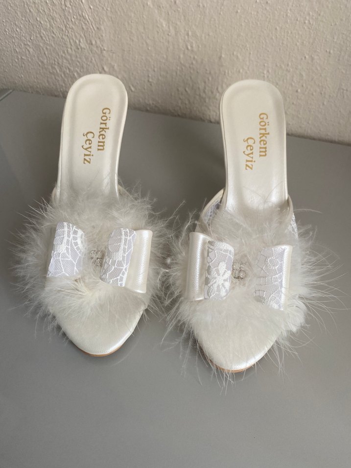 Dolgu topuklu, beyaz kadın terlik. Tüylü detaylı ve desenli fiyonk süslemeli. Sentetik kumaştan, parlak görünümlü. Düğün ve klasik şıklığa uygun.