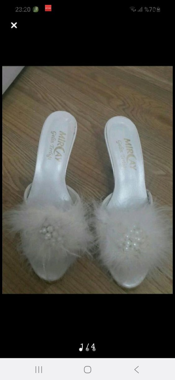 Parlak ipeksi beyaz malzemeden yapılmış, tüy detaylı ve inci süslemeli dolgu topuklu kadın terlik. Vintage düğünler için klasik şıklık. Marka: MIRCAY.