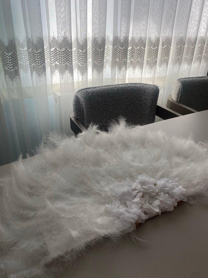 Yumuşak sentetik kumaştan, kürk detaylı, beyaz uzun gelin aksesuarı. Tekne yaka ve askılı, vücuda oturan avant-garde bohem tarzda. ️