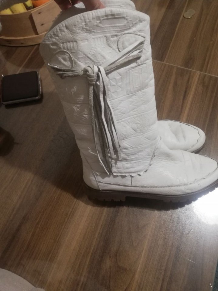 Beyaz renkte, tüylü detaylı, kauçuk malzemeden yapılmış bohem tarzı kadın dolgu topuk çizme. Beyaz tonlarında, desensiz ve günlük kullanıma uygun.Numarası yazmaz ama 39 dur.Yurtdışından hediye gelmişti. Bir iki kez giyildi. Yumuşacık deri ve çok şık. Ufak giyilme çizikleri dışında kusuru yok. Görüntülemeye çalıştım görünmedi o kadar bellisiz.