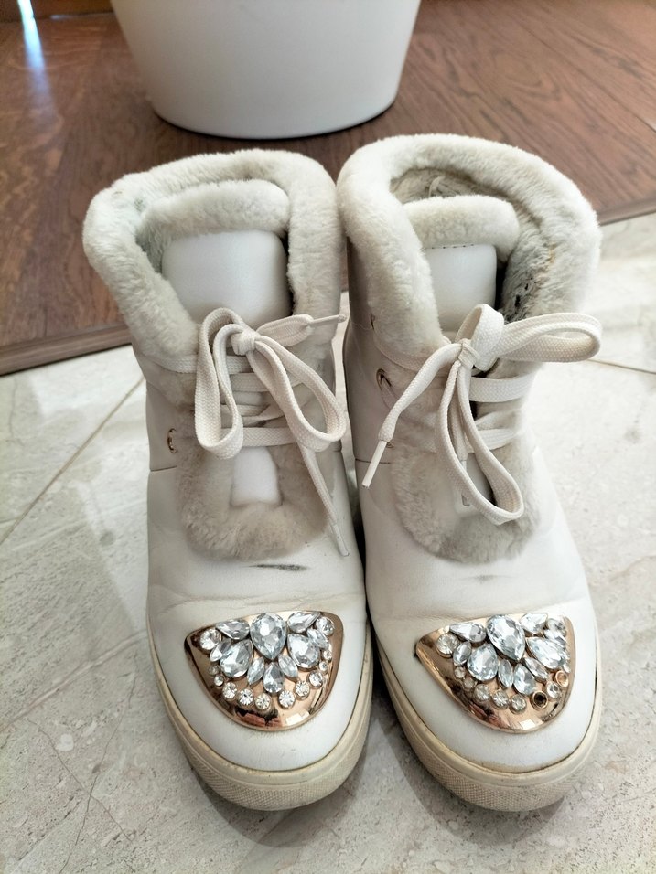 Beyaz süet kadın sneakers, dolgu topuk ve tüylü detaylara sahiptir. İşlemeli ve taşlı süslemelerle günlük rahat sokak stili sunar. Önünde sadece bir taş düştü o sebeple satıyorum. İthal bir bot, çok rahat,