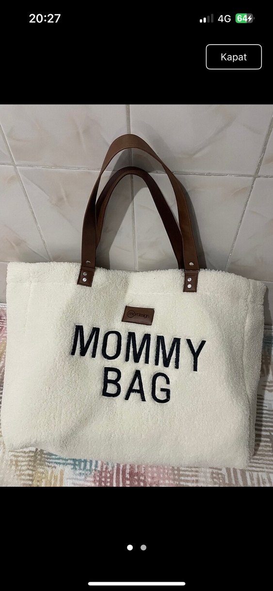 Yumuşak tüylü kumaş ve kahverengi deri saplara sahip, üzerinde 'MOMMY BAG' yazılı beyaz kadın günlük çanta.