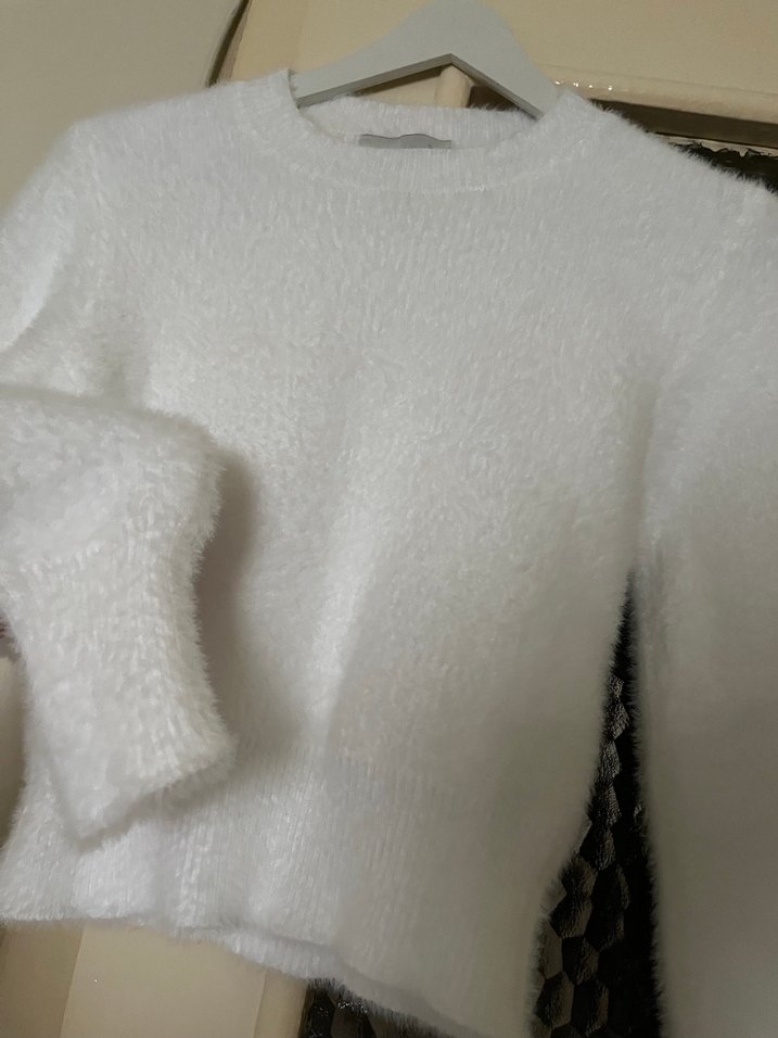Beyaz örgü kadın kazak, uzun kollu ve bisiklet yaka detaylıdır. Yumuşacıkk , sade ve günlük kullanıma uygundur.