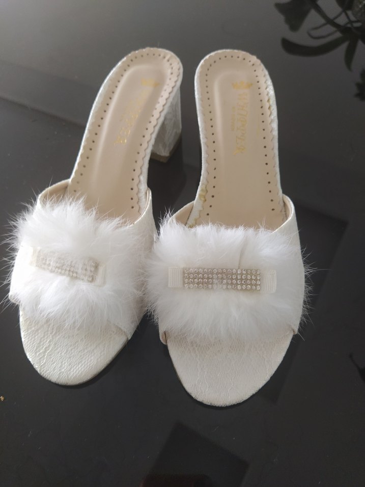 Beyaz, blok topuklu kadın terlikleri yumuşak tüylü detay ve parlak yüzeye sahiptir. Klasik şıklık için düğünlerde uygundur. Kauçuk tabanlıdır.
