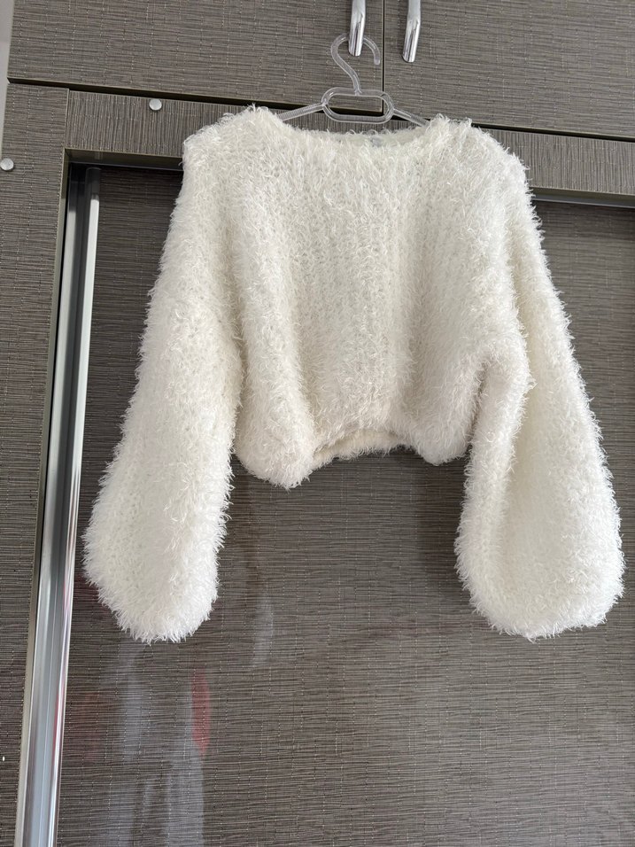 Beyaz tüylü dokusu ve uzun kollu, yuvarlak yakalı kısa kesimi ile rahat, bol kesim kadın kazak. Sokak stiline uygun ve konforlu.