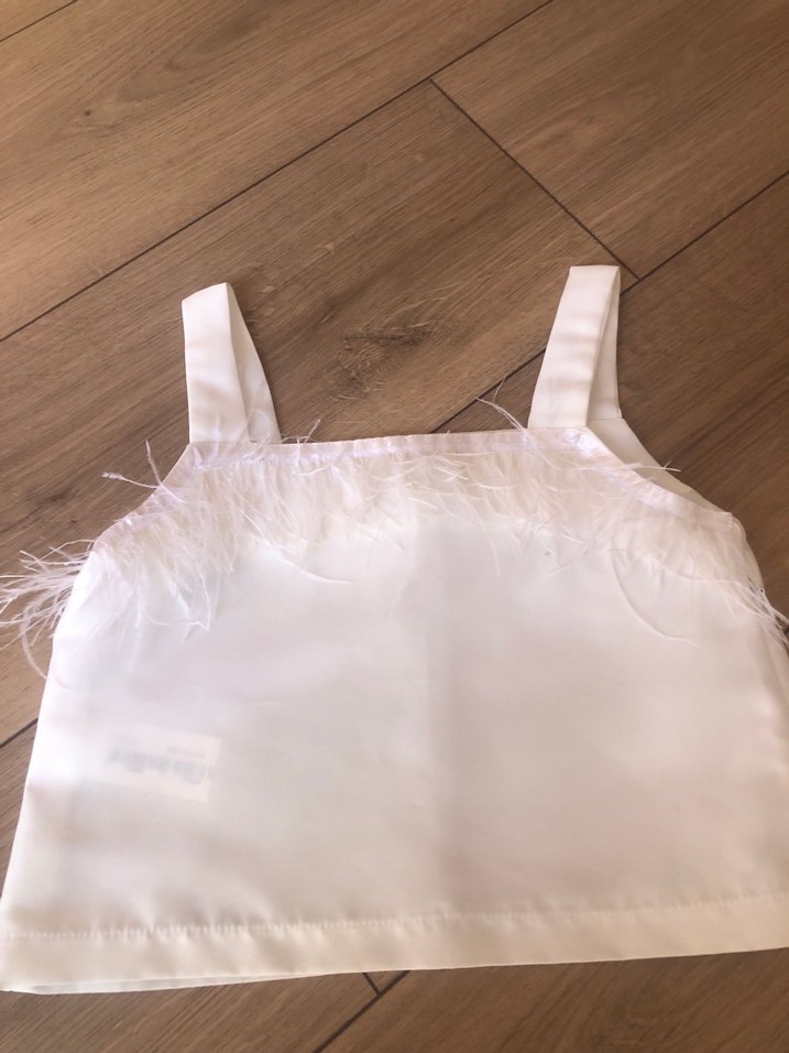 Göğüs kısmında tüylü detaylar ve geniş askıları bulunan beyaz kız çocuk atleti, yumuşak dokulu kumaştan.