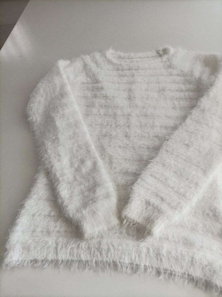 Beyaz tüylü örgü kazak, yuvarlak yaka ve uzun kolludur. Bol kesimi ve yumuşak dokusuyla günlük rahatlık sunar.
