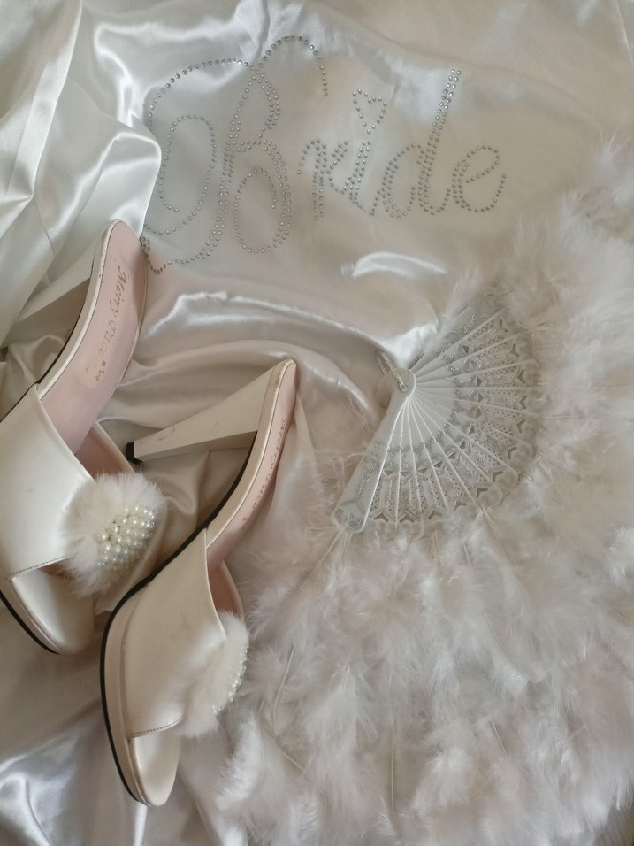 Beyaz tüylü platform topuklu kadın terlikler, işlemeli detaylara sahip. İpeksi malzemeden yapılmış, şık düğünler ve modern tarz için uygun.