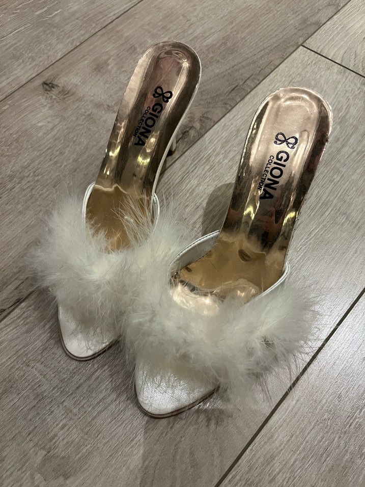 Beyaz ipeksi stiletto topuklu terlik, tüylü detaylar ve parlak yılan deseniyle cesur gelinler için uygun.
