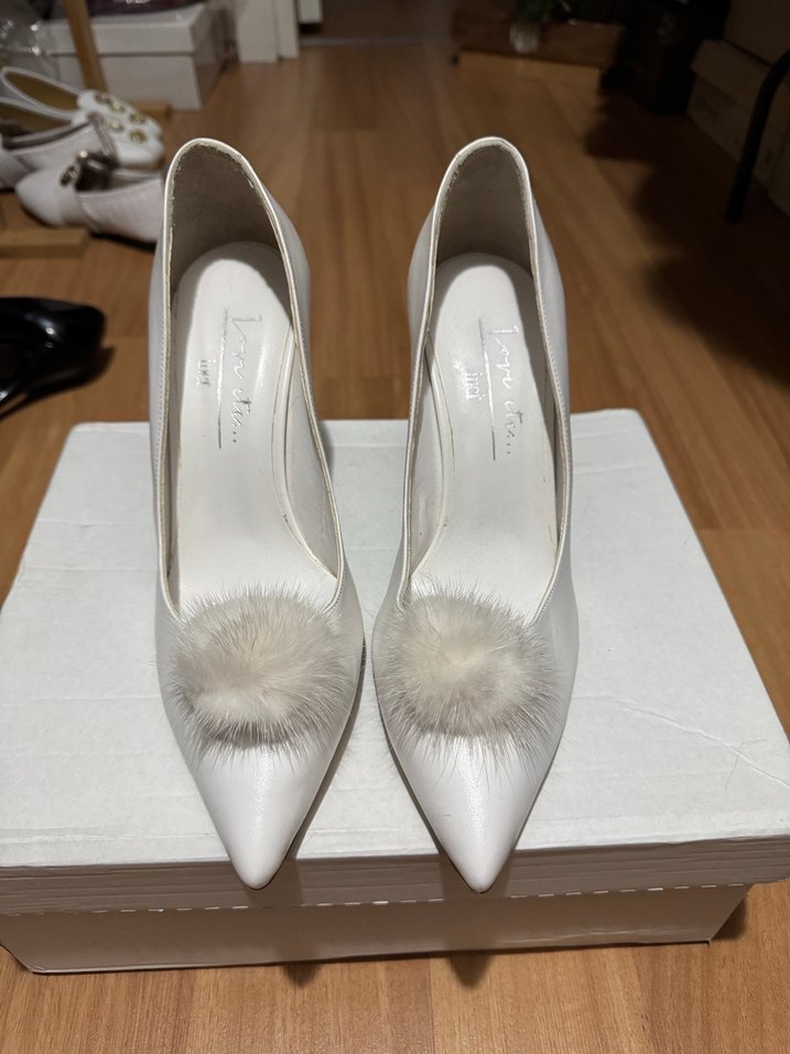 Beyaz, ön kısmında tüylü detay bulunan stiletto topuklu ayakkabılar. Minimalist ve çağdaş tasarıma sahip, düğünler ve klasik şıklık için uygun. 1 kez kullanıldı incinin ayakkabısı