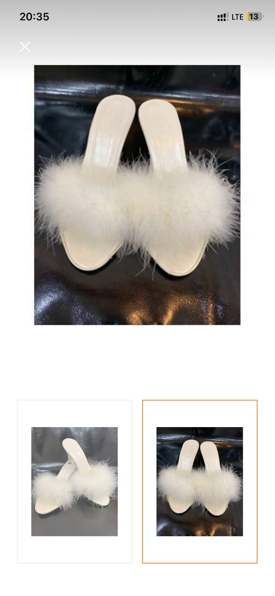 Beyaz, kürklü detaylı, stiletto topuklu kadın terlik. Kauçuk malzemeden üretilmiş, desen içermeyen bu terlikler, rahat ve şık parti stilleri için uygundur. Hiç kullanılmadı.