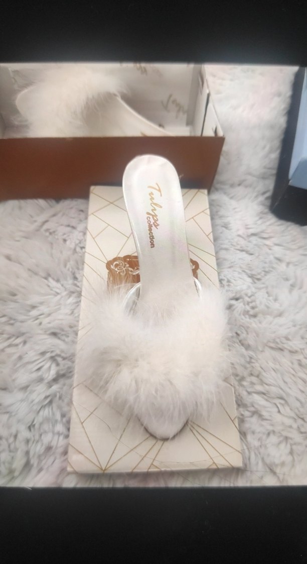 Beyaz, sentetik kumaşlı, tüylü detaylı ve yılan desenli stiletto topuklu kadın terlik. Bohem düğün stiline uygun.