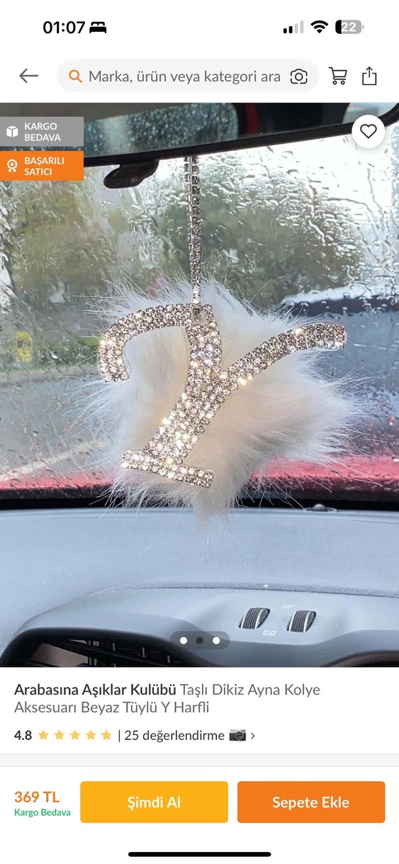 Beyaz tüylü detay ve taşlarla süslenmiş parlak Y harfi, araba dikiz aynası süsü olarak kullanılır. Glamour ve retro esintili bohem tarzda.