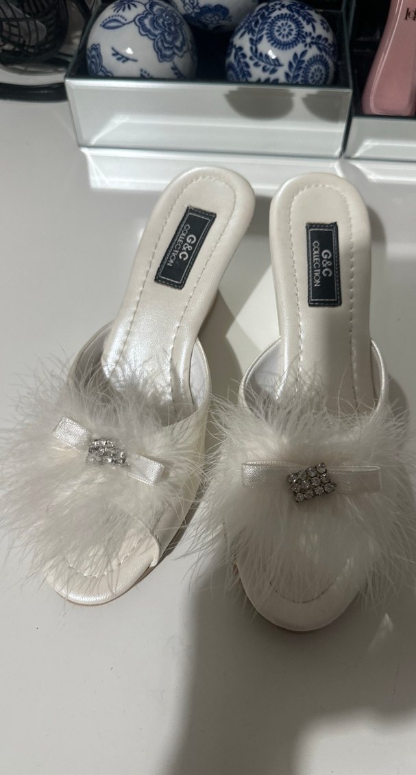 Beyaz renkli, tüylü detaylı ve parlak desenli, ipeksi dokulu yüksek topuklu kadın terlikler. Düğün için şık ve klasik bir seçenek.