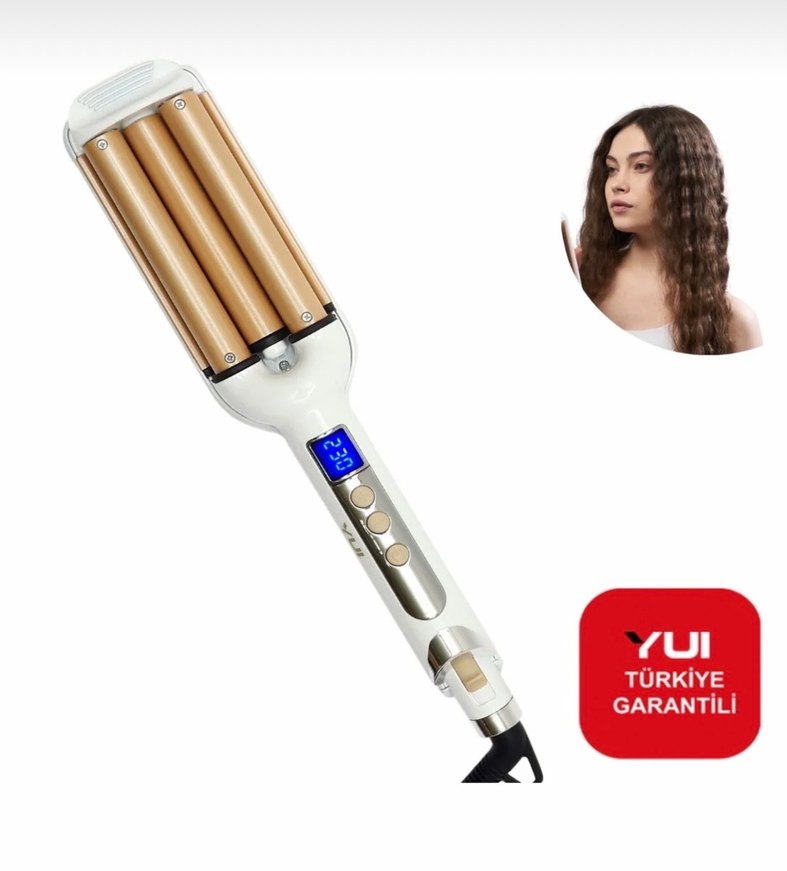 Dijital ekran ve ayarlanabilir ısı özelliğine sahip beyaz üçlü saç dalgalandırıcı. Dalgalı saçlar için uygundur. İki kere kullanıldı
