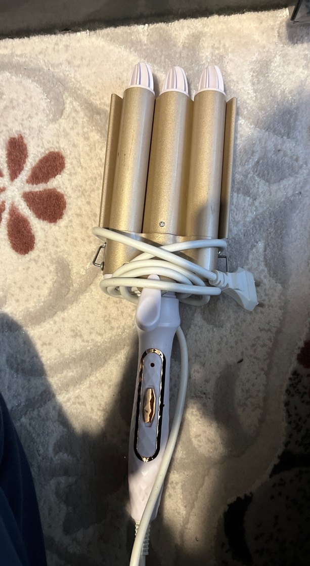 Altın tonlu beyaz üçlü saç maşası, ayarlanabilir ısı kontrolü ve kullanımı kolay güç kablosu ile birlikte gelir. ♀️