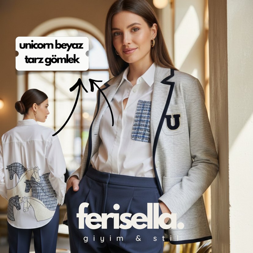 Beyaz Unicorn İşlemeli Tarz Gömlek