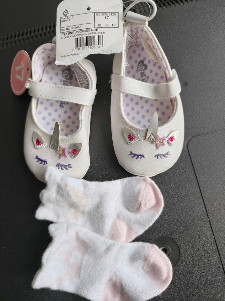 Nakışlı unicorn desenli, beyaz ilk adım ayakkabısı. Cırt cırtlı ve kauçuk malzemeden, pastel tonlarda. Yanında uyumlu çoraplar ile.