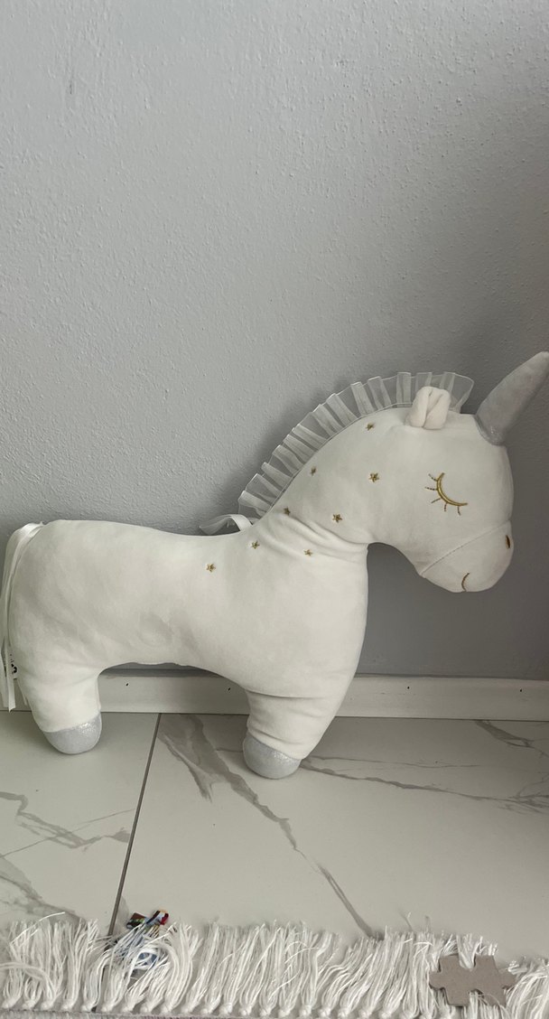 Yumuşak beyaz unicorn peluş oyuncak, altın yıldız detayları ve fırfırlı yele ile süslenmiştir.
