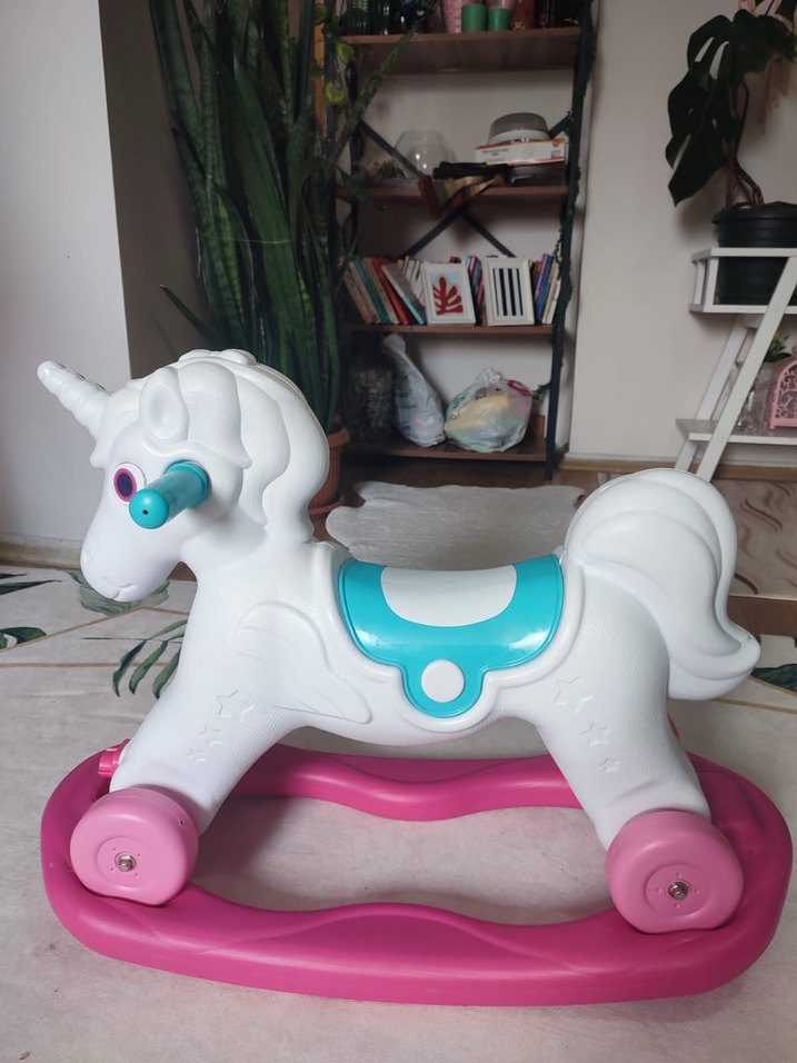 Beyaz unicorn sallanan at oyuncak, pastel pembe taban ve mavi detaylarla çocuklar için eğlenceli bir oyun aracı sunar. Su ve kum aktivite masası sıfır ayarında korgo yok