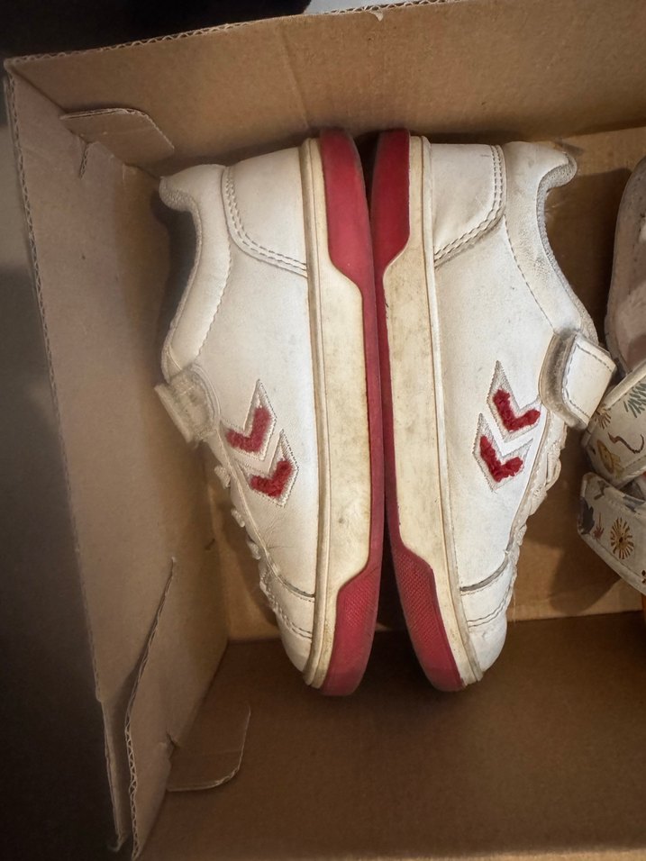 Beyaz, kırmızı detaylı, bantlı çocuk spor ayakkabısı. Kauçuk tabanlı, sade tasarımlı ve rahat bir model.