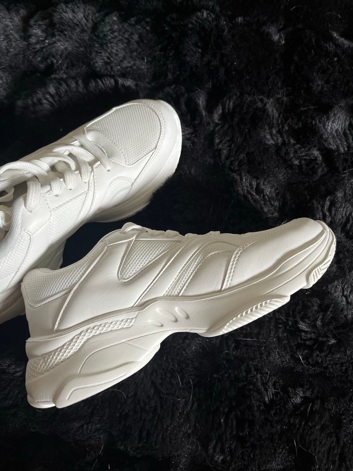 Beyaz renkte, kürklü detaylara sahip kadın spor ayakkabısı. Kauçuk tabanlı, stiletto topuklu ve desensiz, sokak stili için uygun.