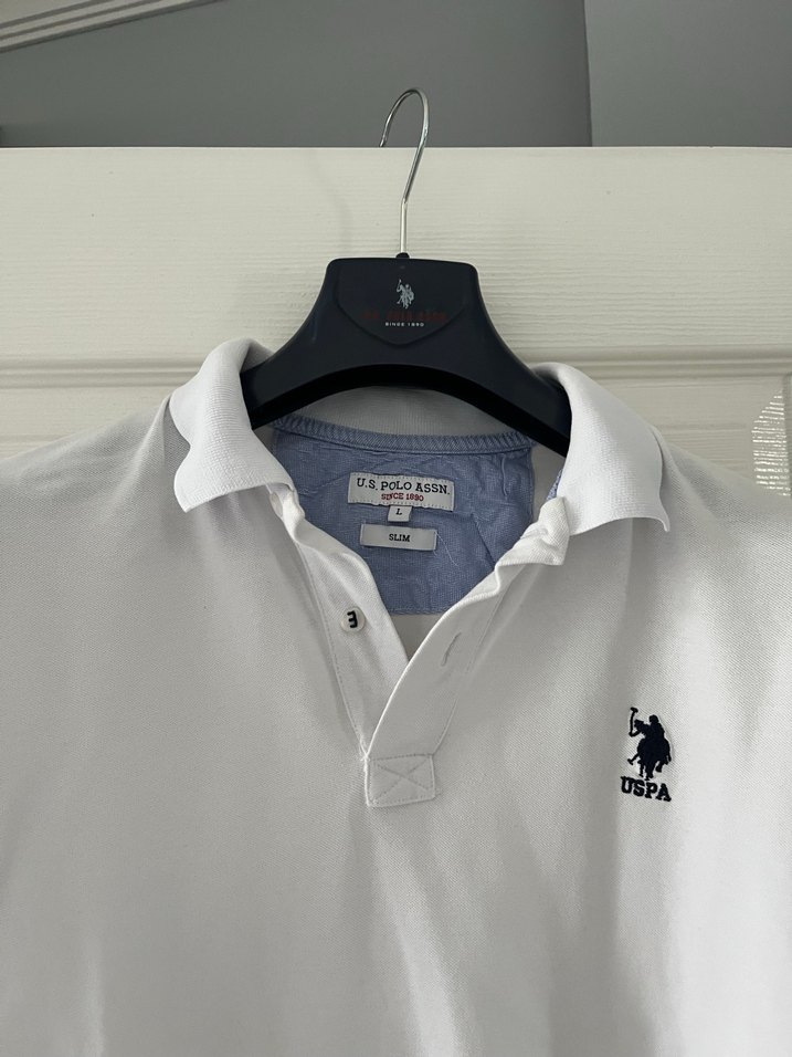 L beden beyaz US Polo Assn. polo yaka tişört, kısa kollu, düğmeli ve pamuklu kumaştan. Küçük baskılı logo detaylı, günlük kullanıma uygun.