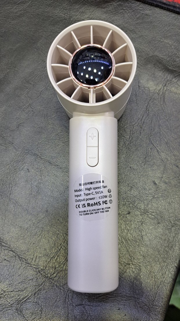 USB Type-C şarjlı beyaz taşınabilir mini vantilatör, yüksek hızlı hava akışı ve kolay düğme kontrolleri sunar. RoHS ve FC sertifikalı. ️
