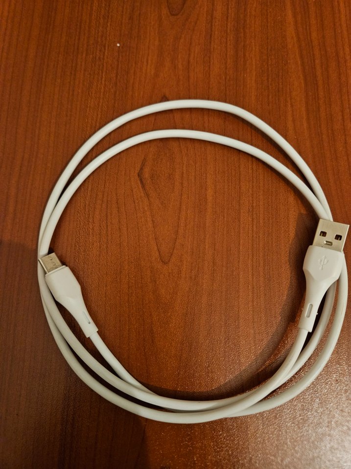 Gri tonlu beyaz USB telefon şarj kablosu, standart USB portlarla uyumludur ve hızlı şarj sağlar.