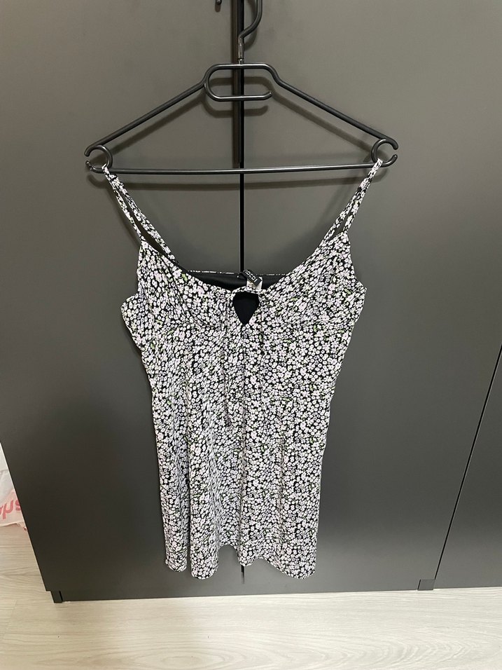 İnce askılı, bağlama detaylı mor beyaz çiçek desenli, sentetik kumaştan mini ve vücuda oturan elbise. Günlük stil için uygundur.